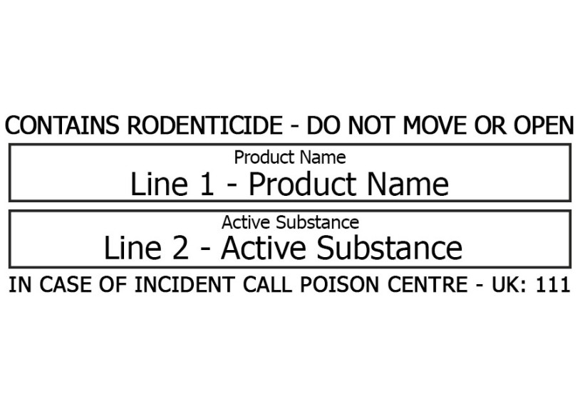 Bait station warning label as required when using rodenticide in bait stations. Line 1 - Enter the product name e.g Contrac Blox Line 2 - Enter the Active Substance e.g Bromadiolone