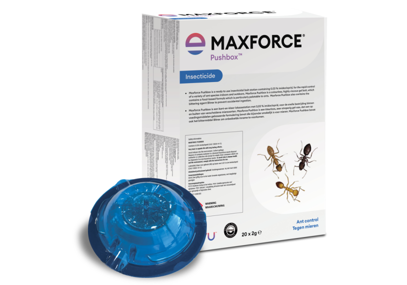 Maxforce Pushbox is a ready to use insecticidal bait station containing 0.03% Imidacloprid, for the rapid control of a variety of ant species indoors and outdoors. Maxforce Pushbox is a colourless, highly viscous gel bait, which contains a food-based formula which is particularly palatable to ants. Maxforce Pushbox also contains the bittering agent Bitrex to prevent accidental ingestion.