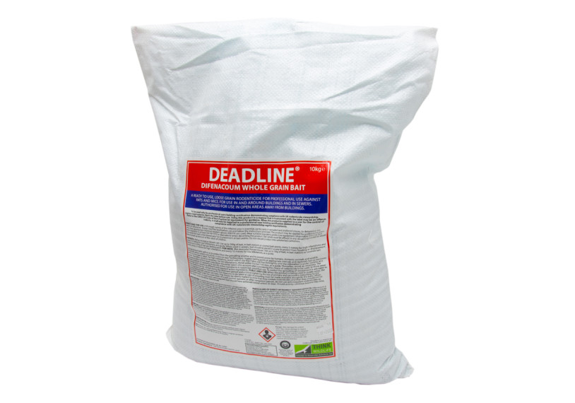 Deadline Difenacoum Whole Grain Bait 10kg A special whole-wheat based anticoagulant rodenticide to control rats and mice in both indoor and outdoor situations. Ideal for use in damp locations. Contains 0.005% Difenacoum. Size: 10kg sack. Professional use only - Proof of competence will be required prior to delivery