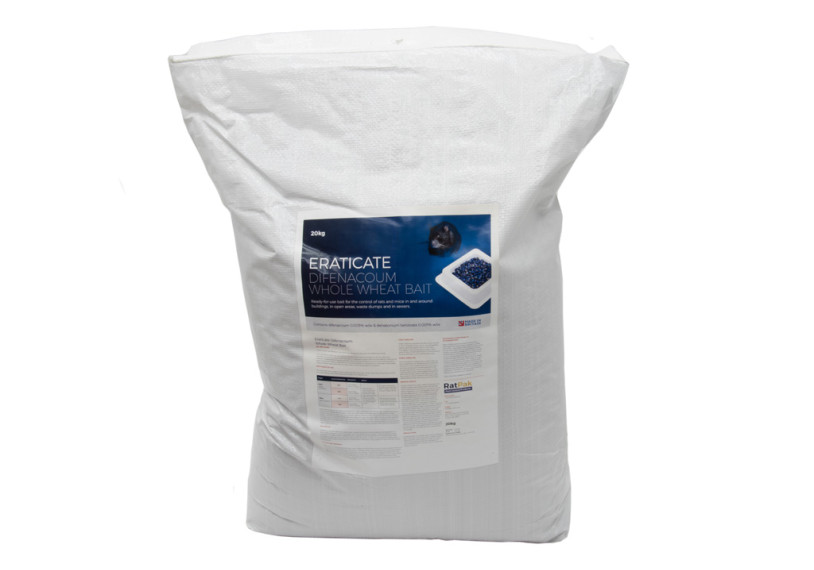 Ready-for-use bait for the control of rats and mice in and around buildings, in open areas, waste dumps and in sewers. Eraticate Whole Wheat is made from high quality heat treated feed which prevents germination and increases the overall attractiveness of the bait to Rodents. Eraticate Whole Wheat is fortified with a unique aroma and taste enhancements which help to increase palatability while growth inhibitors prevent fungi and bacteria in damp conditions.